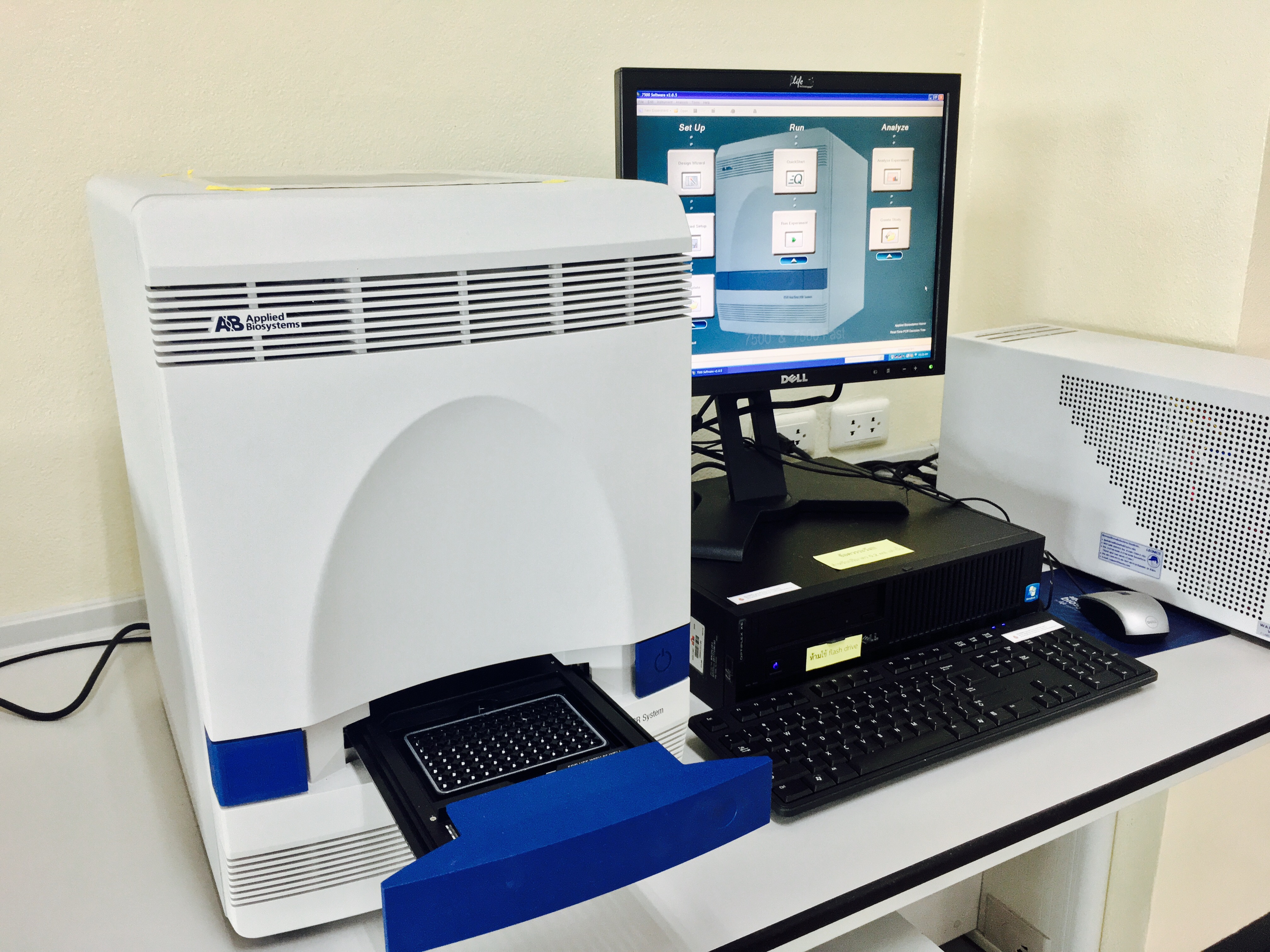 7500 Real-time PCR System เป็นเครื่องเพิ่มปริมาณสารพันธุกรรมในสภาพจริง ควบคุมการทางานด้วยคอมพิวเตอร์ ประกอบด้วย เครื่องเพิ่มปริมาณสารพันธุกรรมในสภาพจริง และ ชุดควบคุมการทางานและประมวลผล มีลักษณะดังนี้